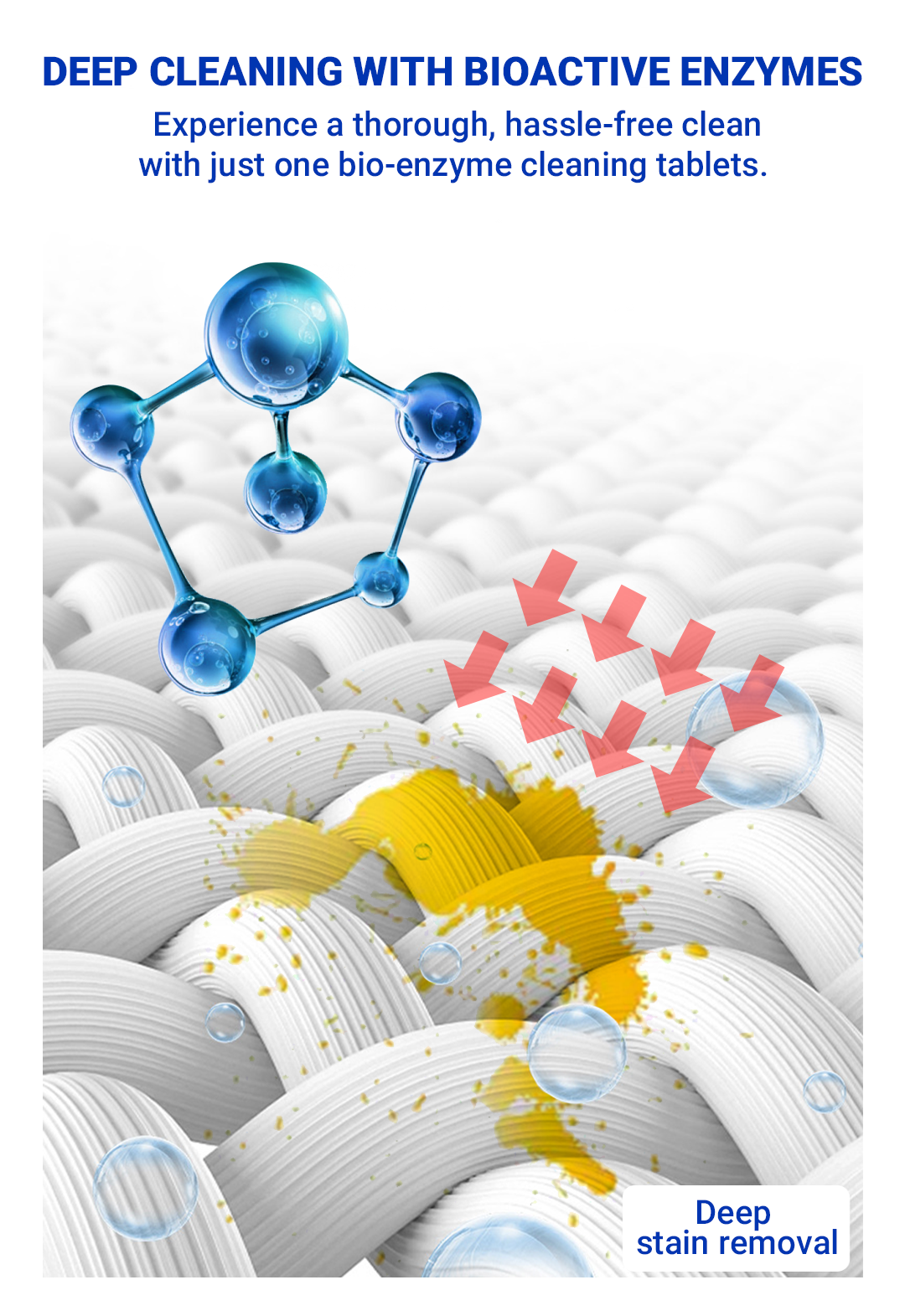 DEEP CLEANING WITH BIOACTIVE ENZYMES -The bioactive enzymes in our tablets prevent dirt buildup, penetrating deep into fibers to break down and remove even the most stubborn stains. Experience a thorough,hassle-free clean with just one bio-enzyme cleaning tablets.